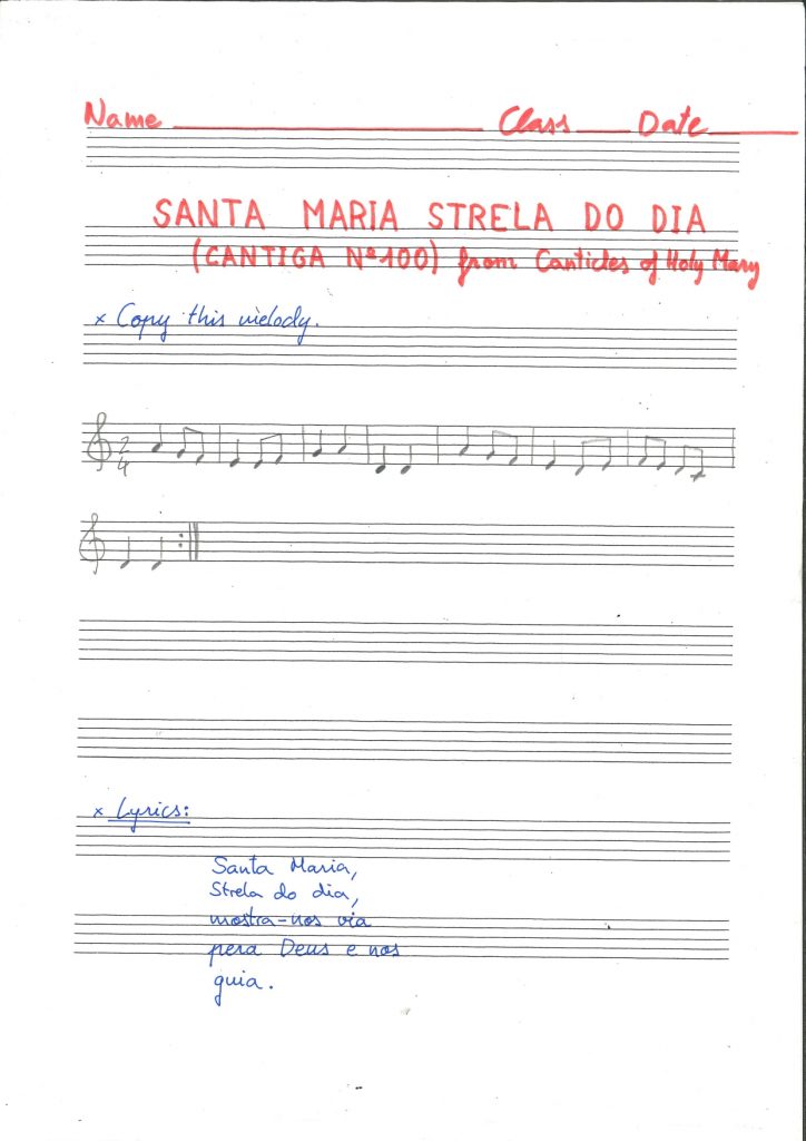 El manuscrit de les Cantigues de Santa María, escrites en galaicoportugués i en notació musical mensurada en la cort del rei Alfons X el Savi durant la segona mitat del segle XIII, primorosament il·lustrades per seqüències de sis vinyetes dibuixades i acolorides per artistes eminents, fins al punt de ser anomenada per Marcelino Menéndez Pelayo Biblia estètica del segle XIII, constituïx una de les col·leccions de cançó monòdica més important de la literatura medieval occidental. De perfil trovadoresc i paralitúrgic, es diferencia de la temàtica obertament profana dels trobadors de la resta d’Europa i de la música sacra de l’època.
