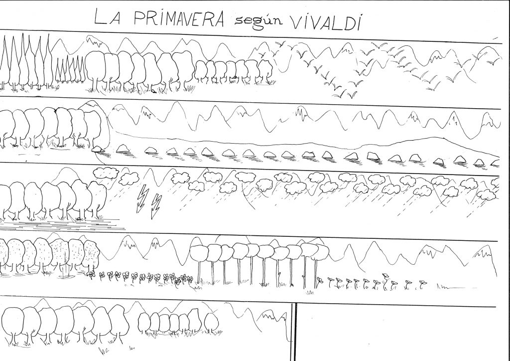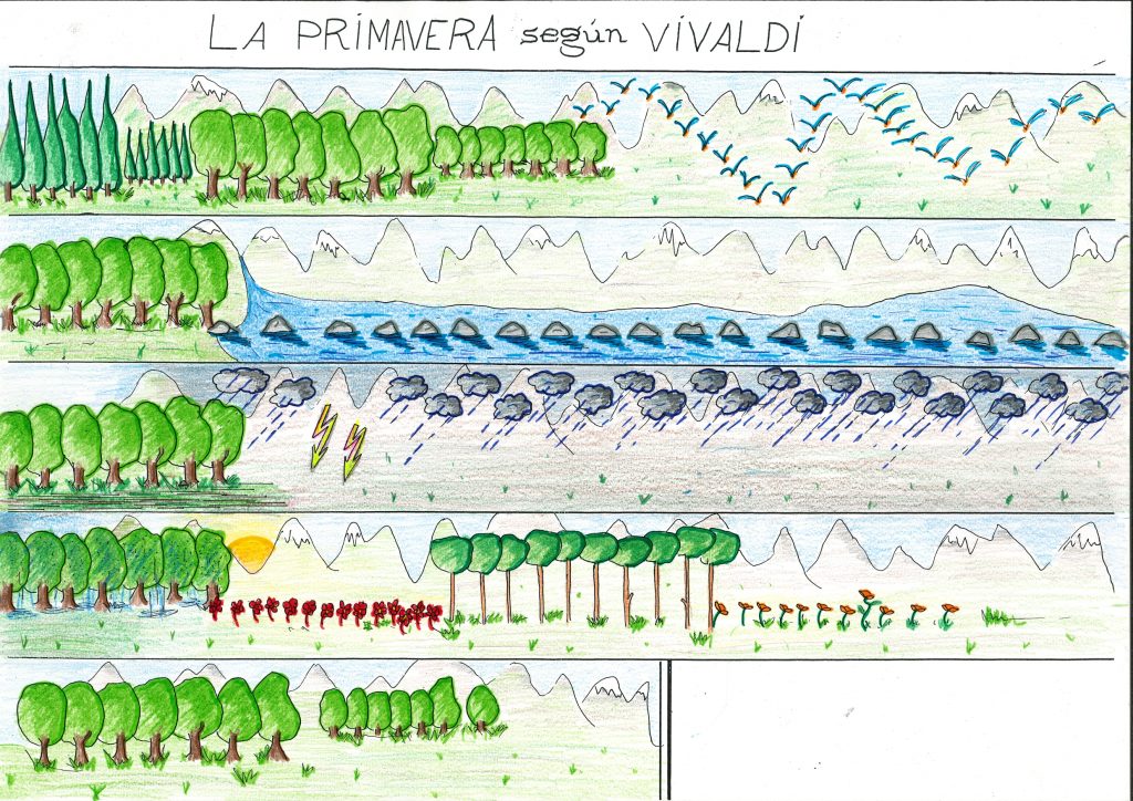«Ja hi ha arribat la primavera… què ocorre en esta estació? Plou molt? L’oratge és inestable? La neu de les muntanyes es desgela i els rius creixen? Les plantes i arbres floreixen? Tornen a cantar els pardals? Doncs fa molt de temps, allà per l’any 1.720, un compositor anomenat Vivaldi va descriure amb música les quatre estacions de l’any. Hui anem a escoltar el 1r moviment de la primavera, una música que segurament escriuria després de fer un passeig pel camp, al començament d’aquesta estació, per a contar totes les coses que hi havia vist.»
